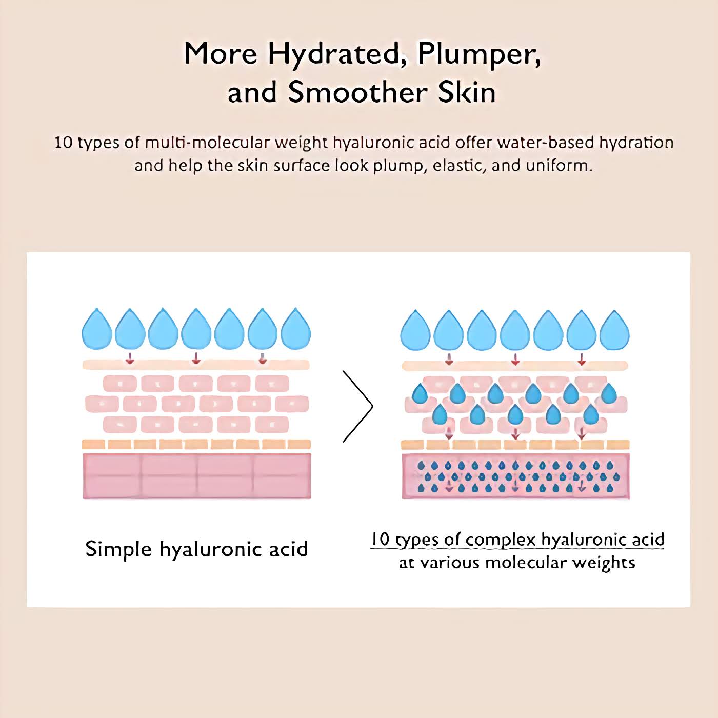 💧 10 tipų hialurono rūgštys – skirtingo dydžio molekulės veikia tiek odos paviršiuje, tiek giliau.
